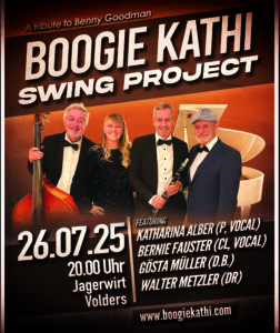 Am Freitag, den 26. Juli, lädt das Boogie Kathi Swing Project zu einem besonderen Abend voller Rhythmus, Energie und Nostalgie ein. Beim gemütlichen Jagerwirt in Volders wird die Bühne zum Schauplatz einer musikalischen Reise in die glanzvolle Welt des Swing.Mit einem Mix aus mitreißendem Boogie-Woogie, lässigem Jazz und tanzbarem Swing bringt die Band den Sound der 30er und 40er Jahre zurück – lebendig, leidenschaftlich und authentisch.