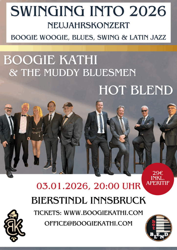 Mitreißende Rhythmen, groovige Beats und eine gehörige Portion Lebensfreude: Unter dem Motto Swingin’ into 2026 sorgen Boogie Kathi & the Muddy Bluesmen sowie Hot Blend für einen Abend voller Energie und guter Laune. Zwischen Boogie, Blues und Swing treffen sich virtuoses Spiel und pure Spielfreude – eine Einladung, das Tanzbein zu schwingen und das neue Jahr schwungvoll zu beginnen.